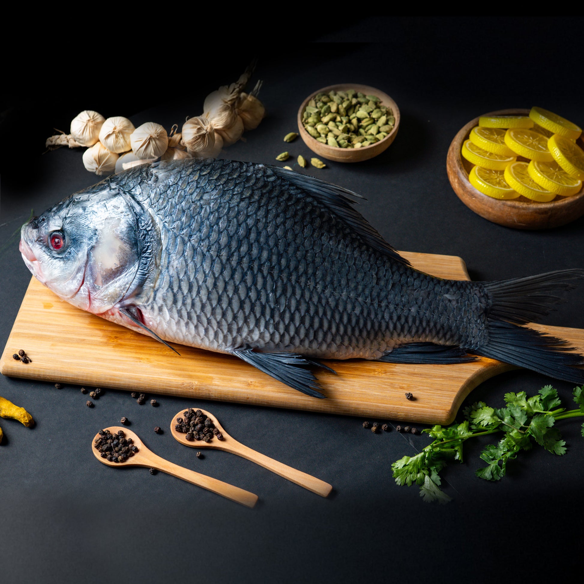 Experience unreal culinary delight with our large Catla fish head, meticulously cleaned and cut for your convenience. Known for its rich flavor and tender texture, Catla head is perfect for traditional Bengali delicacies like fish head curry. Packed with nutrients like protein, Omega-3 fatty acids, and essential minerals, it adds much needed nutrients to your meal. Sourced fresh from our own dams and processed at our facilities, we ensure you receive top-tier fish without any preservatives.