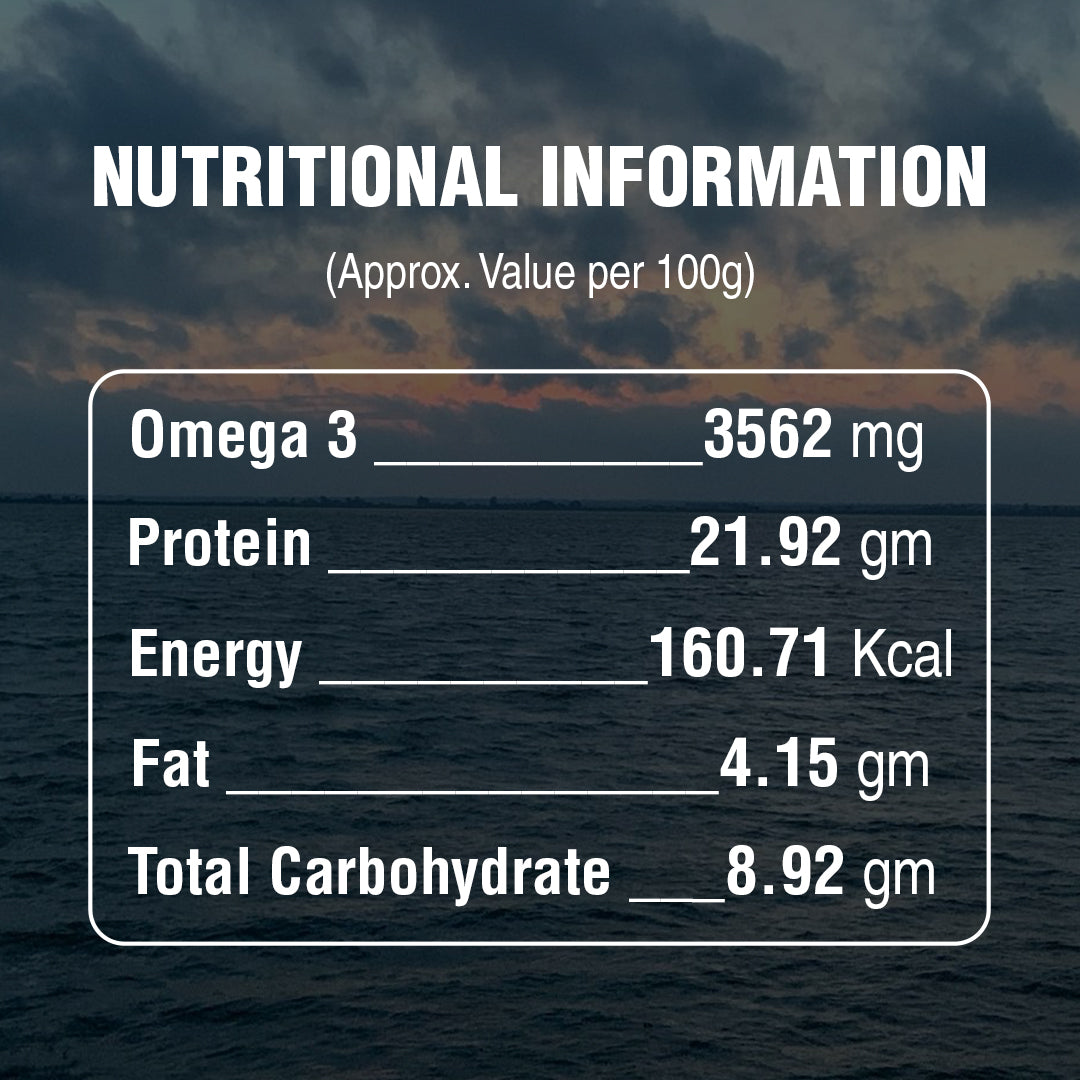 Approx. Values Per 100g: Calories: 80 kcal Protein: 18g Fat: 2.5g Saturated Fat: 0.5g Omega-3 Fatty Acids: 0.3g