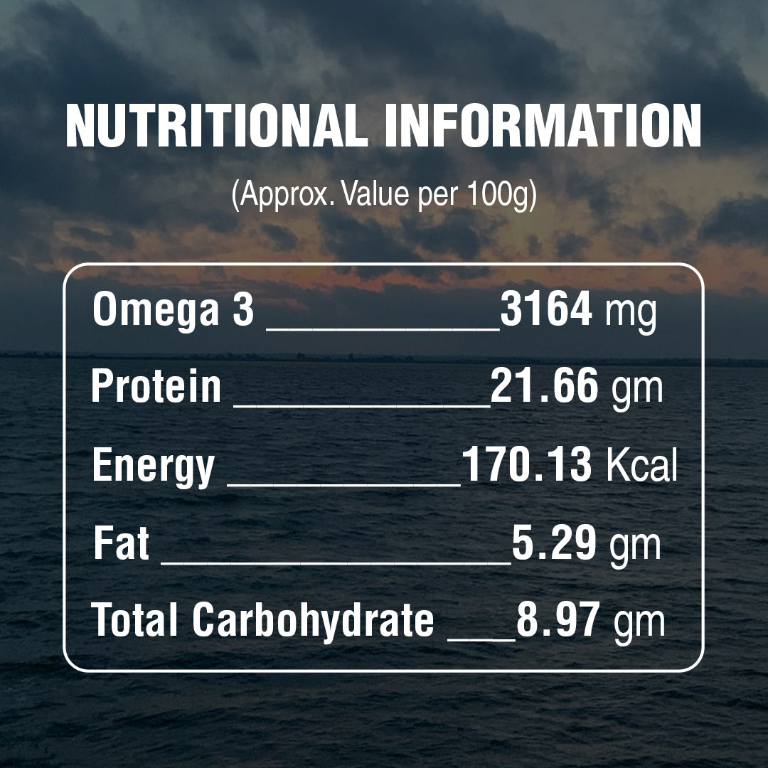 Approx. Values Per 100g: Calories: 85 kcal Protein: 19g Total Fat: 1g Omega-3 Fatty Acids: 150 mg