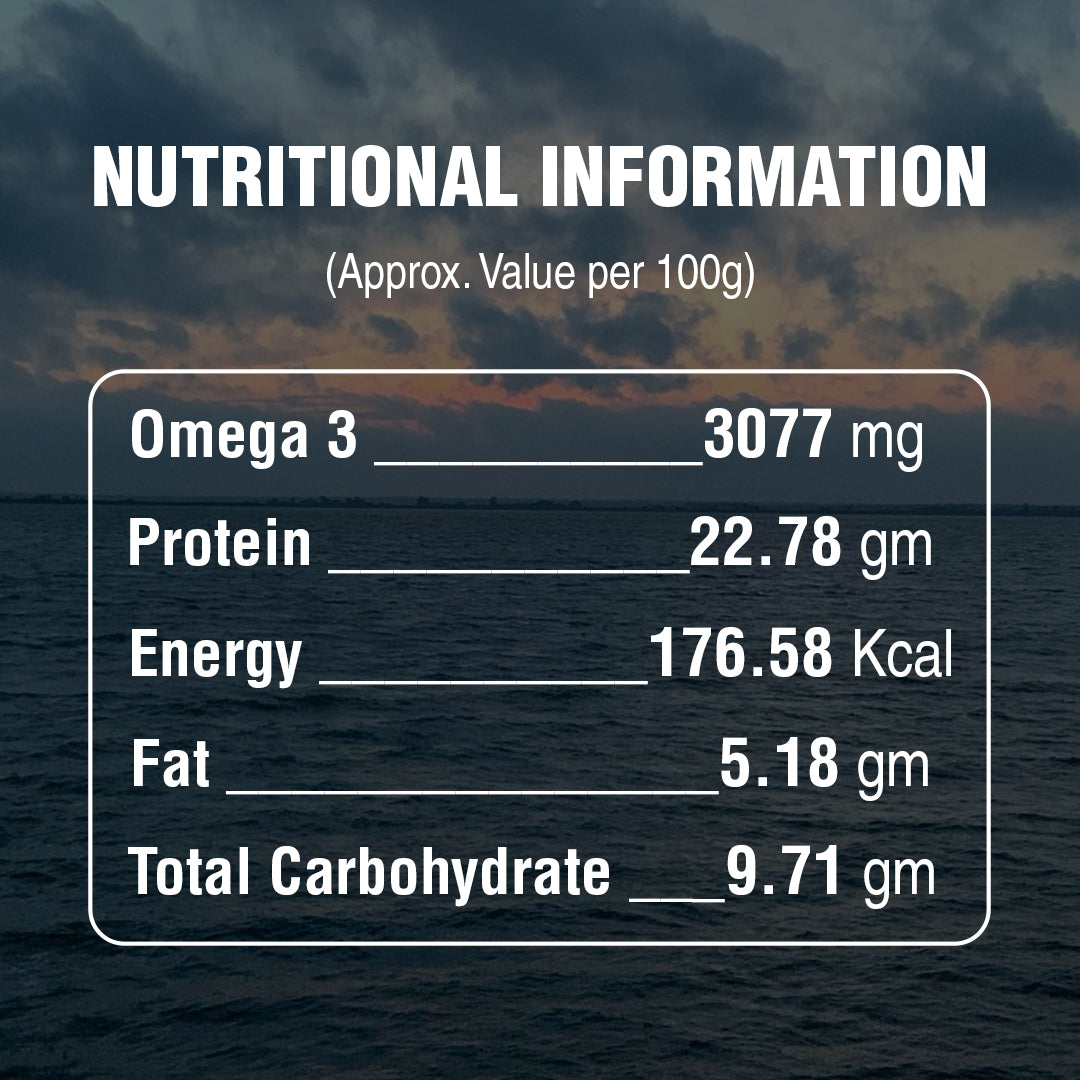 Approx. Values Per 100g: Calories: 120 kcal Protein: 22g Fat: 3g Omega-3 Fatty Acids: 0.4g