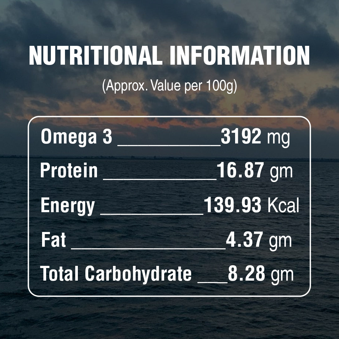 Approx. Values Per 100g: Calories: 90 kcal Protein: 20g Fat: 2g Omega-3 Fatty Acids: 0.2g